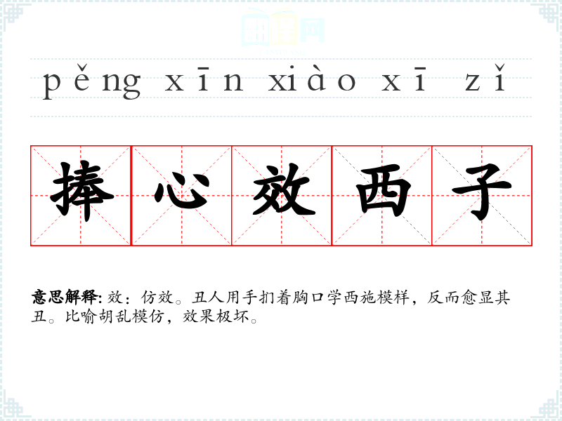 | 捧心效西子 | 效:仿效。丑人用手扪着胸口学西施模样,反而愈显其丑。比喻胡乱模仿,效果极坏。 |