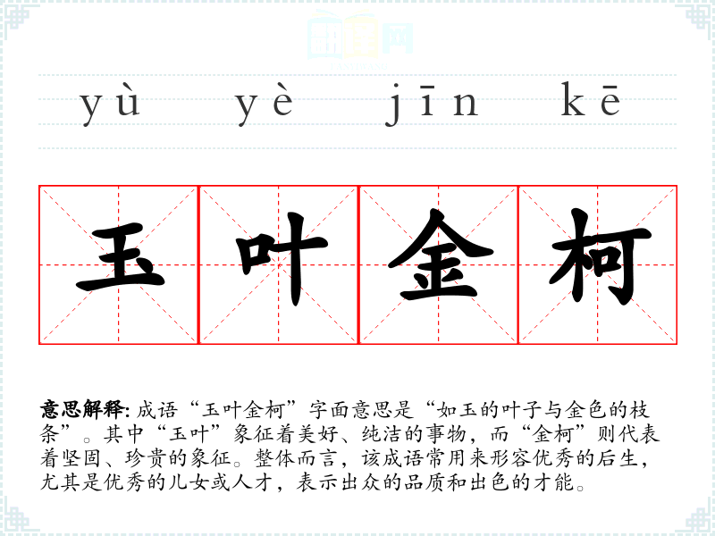 “玉叶金柯”出自《礼记·中庸》。在古代,玉和金都是珍贵的材料,常用来比喻优秀的人才或美好的事物。成语的使用反映了古人对于家族和后代的期望与重视。