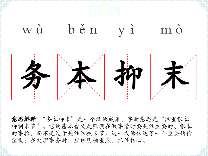 “务本抑末”出自《尚书》,原文为“务本抑末,故不见于小”。这句话强调了在治理国家和处理事务时,必须重视根本问题,而不是琐碎的末节。在古代,治理与管理的智慧常常体现在如何平衡关注的重点上,因此这一成语也常被用来指导个人和集体的行为。