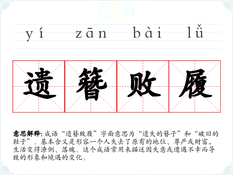 成语“遗簪败履”字面意思为“遗失的簪子”和“破旧的鞋子”。基本含义是形容一个人失去了原有的地位、尊严或财富,生活变得潦倒、落魄。这个成语常用来描述因失意或遭遇不幸而导致的形象和境遇的变化。