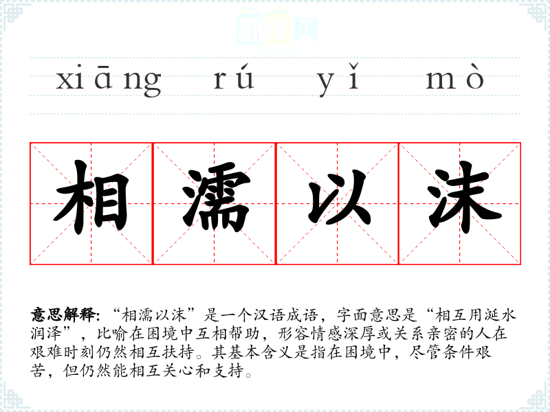 “相濡以沫”是一个汉语成语,字面意思是“相互用涎水润泽”,比喻在困境中互相帮助,形容情感深厚或关系亲密的人在艰难时刻仍然相互扶持。其基本含义是指在困境中,尽管条件艰苦,但仍然能相互关心和支持。