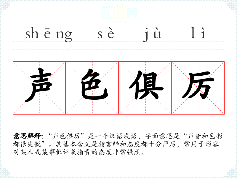 | 声色俱厉 | 声色:说话时的声音和脸色;厉:严厉。说话时声音和脸色都很严厉。 |