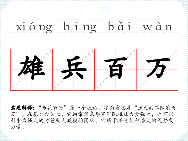 该成语的历史背景可以追溯到古代战争时期。虽然具体的出处并不明确,但“雄兵”指的是强大的军队,而“百万”则强调其规模庞大。这个成语反映了古代军事力量的重要性,常用于描述历史上著名的战役或***的征伐。