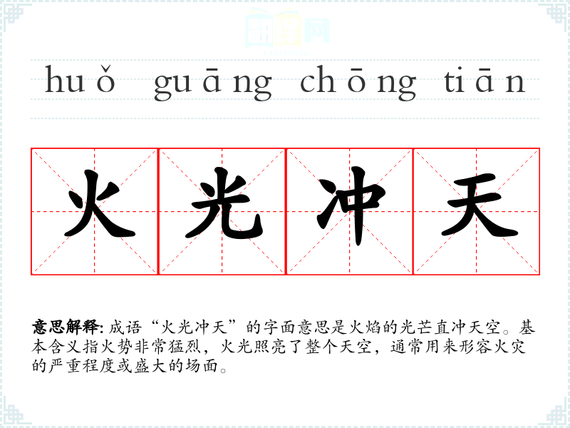 成语“火光冲天”的字面意思是火焰的光芒直冲天空。基本含义指火势非常猛烈,火光照亮了整个天空,通常用来形容火灾的严重程度或盛大的场面。
