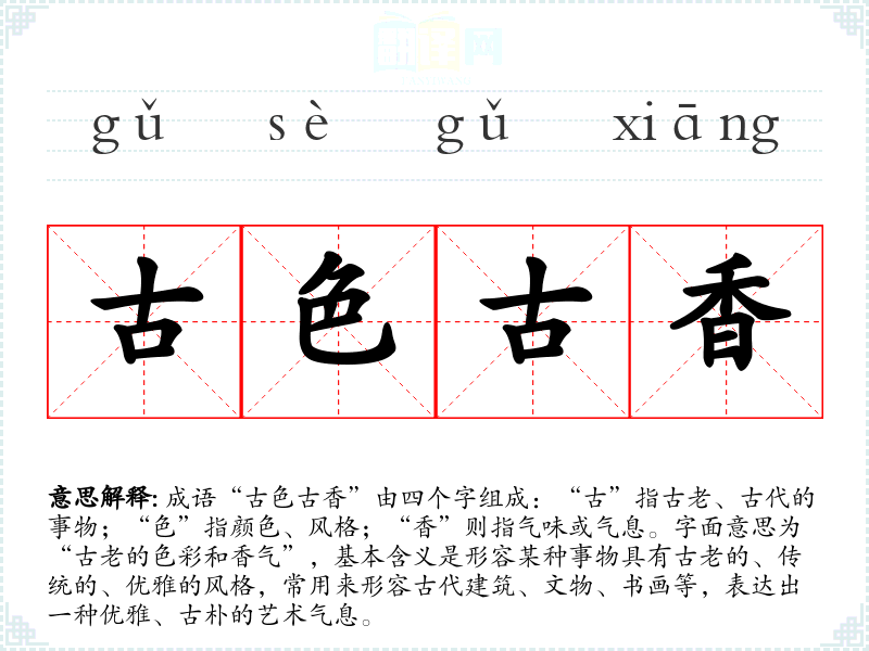 成语“古色古香”由四个字组成:“古”指古老、古代的事物;“色”指颜色、风格;“香”则指气味或气息。字面意思为“古老的色彩和香气”,基本含义是形容某种事物具有古老的、传统的、优雅的风格,常用来形容古代建筑、文物、书画等,表达出一种优雅、古朴的艺术气息。