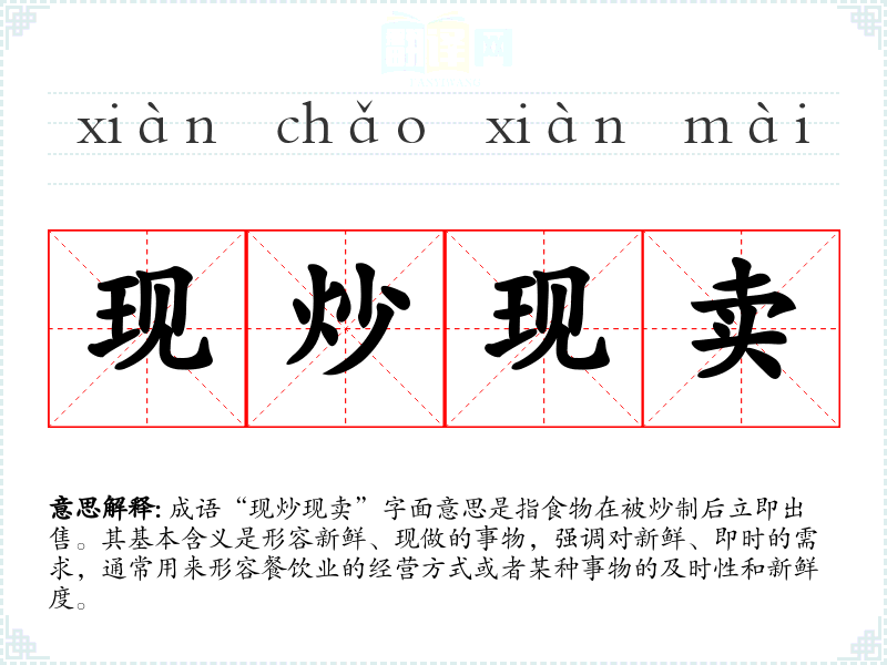 成语“现炒现卖”字面意思是指食物在被炒制后立即出售。其基本含义是形容新鲜、现做的事物,强调对新鲜、即时的需求,通常用来形容餐饮业的经营方式或者某种事物的及时性和新鲜度。