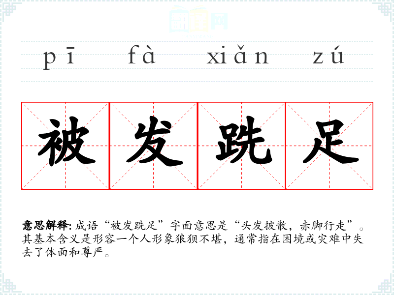 成语“被发跣足”字面意思是“头发披散,赤脚行走”。其基本含义是形容一个人形象狼狈不堪,通常指在困境或灾难中失去了体面和尊严。