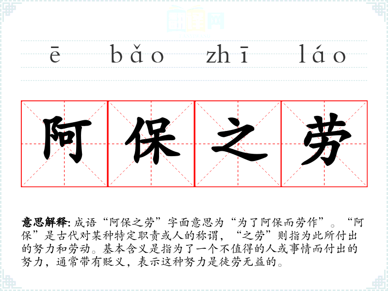成语“阿保之劳”字面意思为“为了阿保而劳作”。“阿保”是古代对某种特定职责或人的称谓,“之劳”则指为此所付出的努力和劳动。基本含义是指为了一个不值得的人或事情而付出的努力,通常带有贬义,表示这种努力是徒劳无益的。