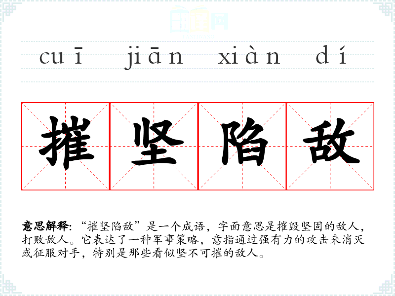 “摧坚陷敌”是一个成语,字面意思是摧毁坚固的敌人,打败敌人。它表达了一种军事策略,意指通过强有力的攻击来消灭或征服对手,特别是那些看似坚不可摧的敌人。