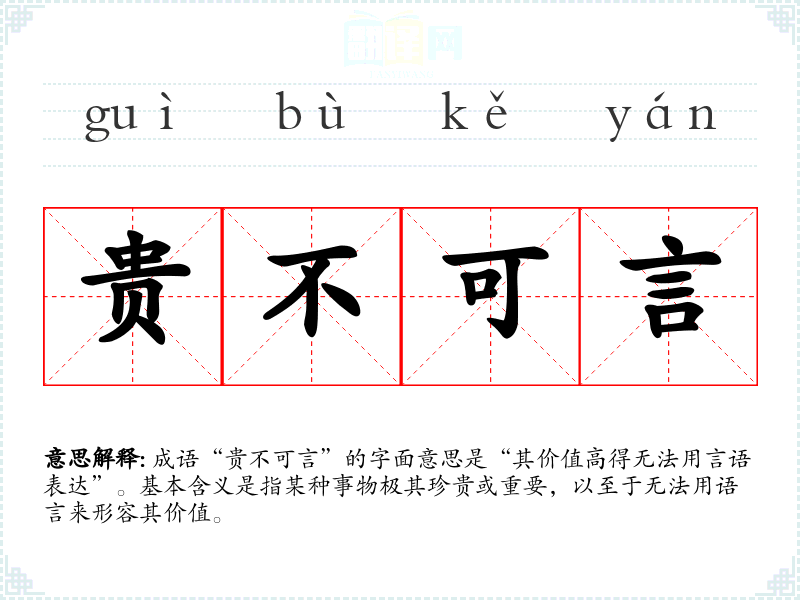 成语“贵不可言”的字面意思是“其价值高得无法用言语表达”。基本含义是指某种事物极其珍贵或重要,以至于无法用语言来形容其价值。
