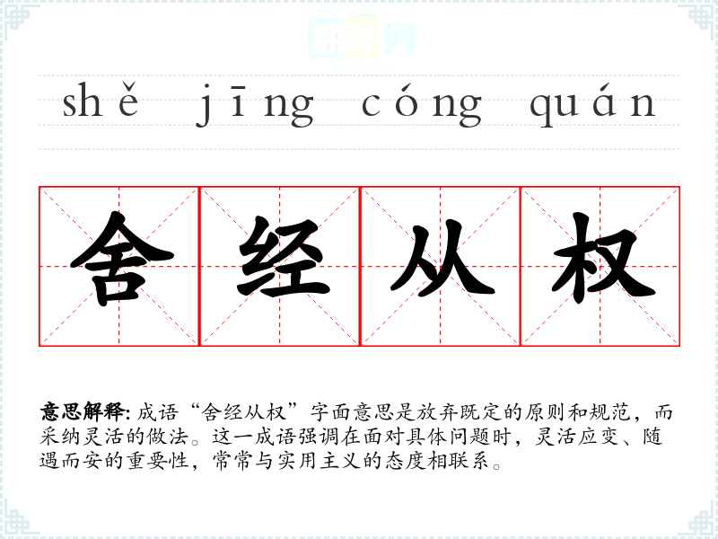 成语“舍经从权”字面意思是放弃既定的原则和规范,而采纳灵活的做法。这一成语强调在面对具体问题时,灵活应变、随遇而安的重要性,常常与实用主义的态度相联系。
