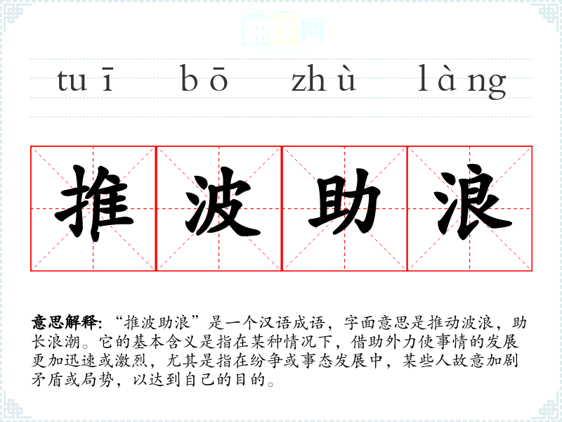 “推波助浪”是一个汉语成语,字面意思是推动波浪,助长浪潮。它的基本含义是指在某种情况下,借助外力使事情的发展更加迅速或激烈,尤其是指在纷争或事态发展中,某些人故意加剧矛盾或局势,以达到自己的目的。