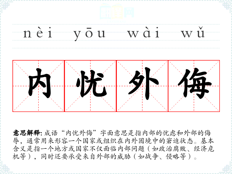 成语“内忧外侮”字面意思是指内部的忧虑和外部的侮辱,通常用来形容一个国家或组织在内外困境中的窘迫状态。基本含义是指一个地方或国家不仅面临内部问题(如政治腐败、经济危机等),同时还要承受来自外部的威胁(如战争、侵略等)。