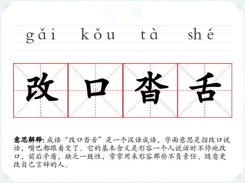 成语“改口沓舌”是一个汉语成语,字面意思是指改口说话,嘴巴都跟着变了。它的基本含义是形容一个人说话时不停地改口,前后矛盾,缺乏一致性,常常用来形容那些不负责任、随意更改自己言辞的人。