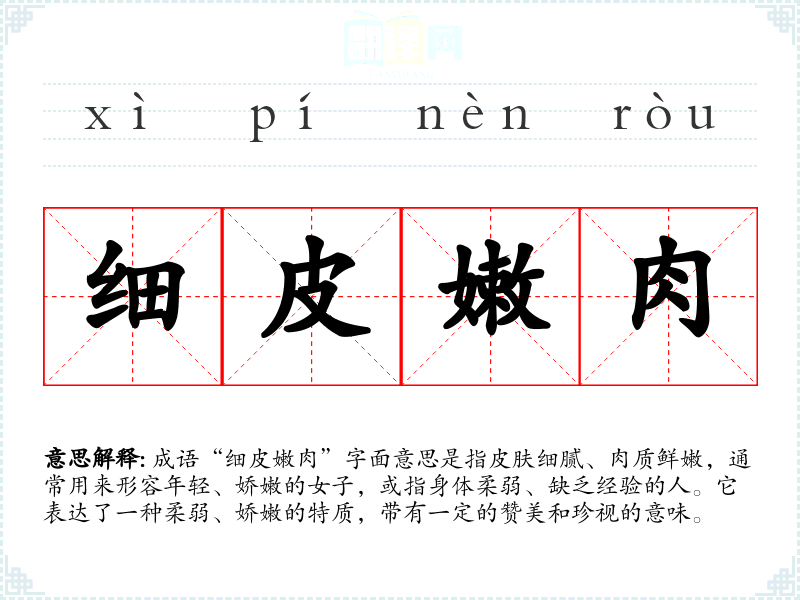 成语“细皮嫩肉”字面意思是指皮肤细腻、肉质鲜嫩,通常用来形容年轻、娇嫩的女子,或指身体柔弱、缺乏经验的人。它表达了一种柔弱、娇嫩的特质,带有一定的赞美和珍视的意味。