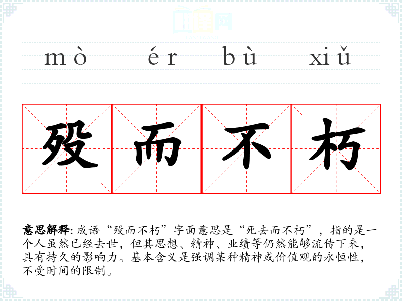 成语“殁而不朽”字面意思是“死去而不朽”,指的是一个人虽然已经去世,但其思想、精神、业绩等仍然能够流传下来,具有持久的影响力。基本含义是强调某种精神或价值观的永恒性,不受时间的限制。