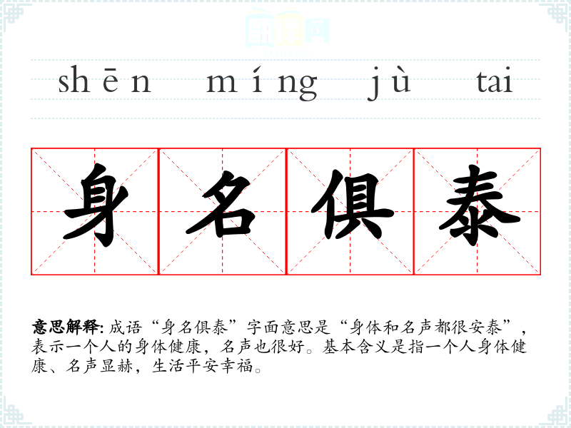 “身名俱泰”来源于古代文献,最早见于《太原志》。它的使用反映了古人对身体健康和声誉的重视,体现了社会对个人成就和生存状态的期望。