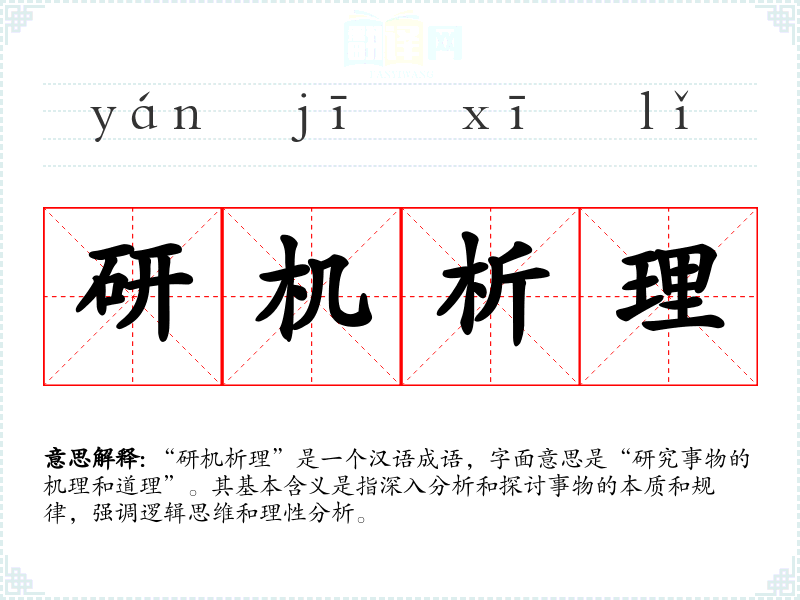 “研机析理”是一个汉语成语,字面意思是“研究事物的机理和道理”。其基本含义是指深入分析和探讨事物的本质和规律,强调逻辑思维和理性分析。