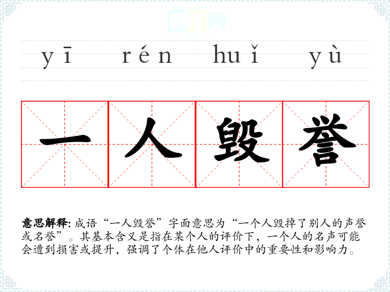 成语“一人毁誉”字面意思为“一个人毁掉了别人的声誉或名誉”。其基本含义是指在某个人的评价下,一个人的名声可能会遭到损害或提升,强调了个体在他人评价中的重要性和影响力。