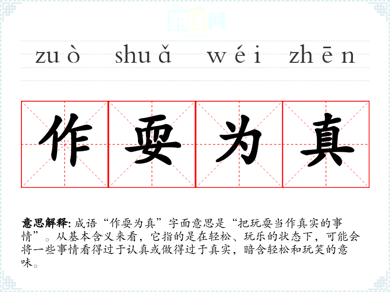 成语“作耍为真”字面意思是“把玩耍当作真实的事情”。从基本含义来看,它指的是在轻松、玩乐的状态下,可能会将一些事情看得过于认真或做得过于真实,暗含轻松和玩笑的意味。