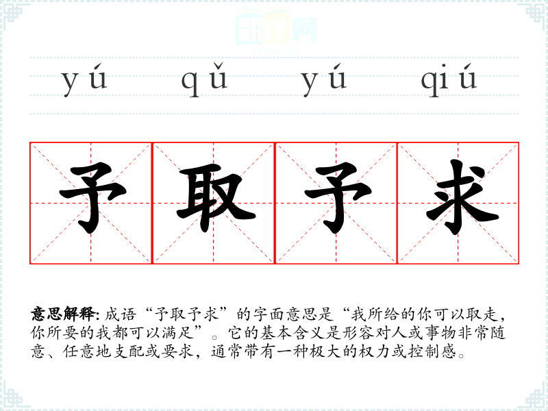 成语“予取予求”的字面意思是“我所给的你可以取走,你所要的我都可以满足”。它的基本含义是形容对人或事物非常随意、任意地支配或要求,通常带有一种极大的权力或控制感。