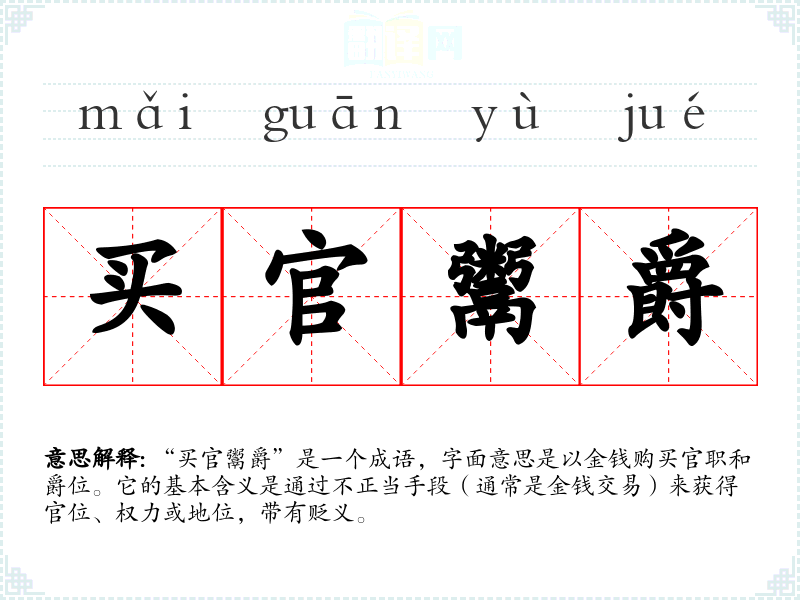 “买官鬻爵”是一个成语,字面意思是以金钱购买官职和爵位。它的基本含义是通过不正当手段(通常是金钱交易)来获得官位、权力或地位,带有贬义。