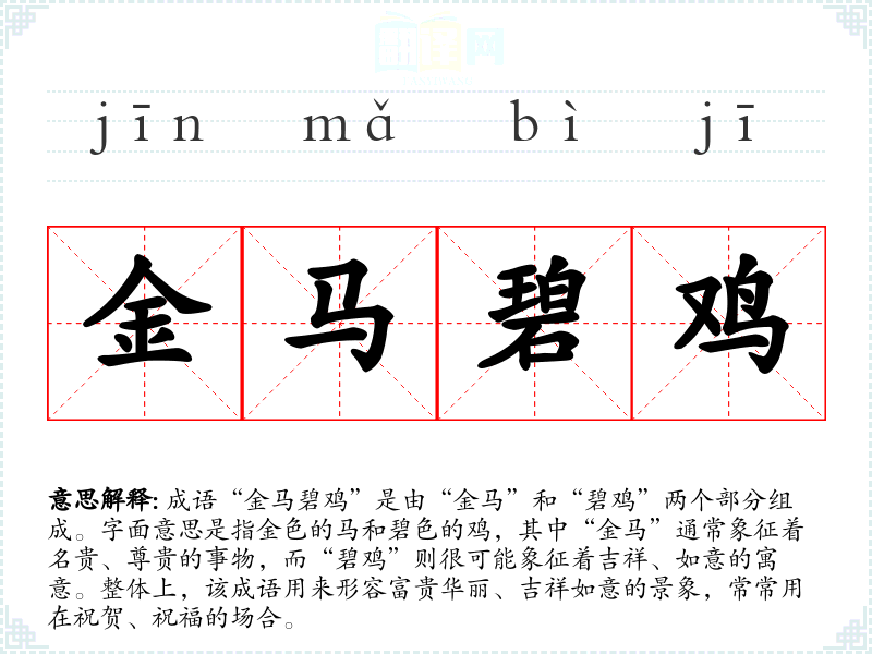成语“金马碧鸡”是由“金马”和“碧鸡”两个部分组成。字面意思是指金色的马和碧色的鸡,其中“金马”通常象征着名贵、尊贵的事物,而“碧鸡”则很可能象征着吉祥、如意的寓意。整体上,该成语用来形容富贵华丽、吉祥如意的景象,常常用在祝贺、祝福的场合。