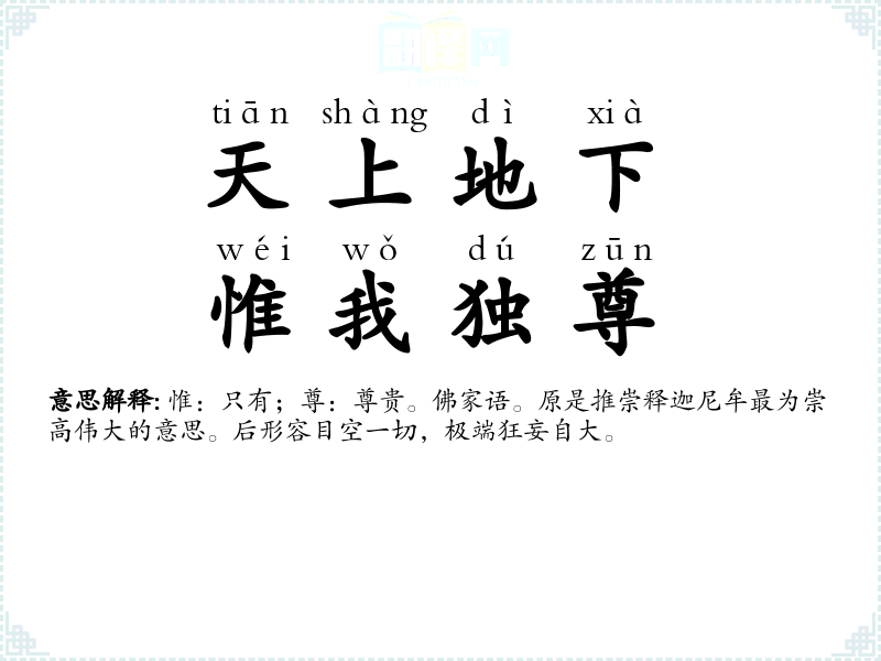 惟:只有;尊:尊贵。佛家语。原是推崇释迦尼牟最为崇高伟大的意思。后形容目空一切,极端狂妄自大。 |