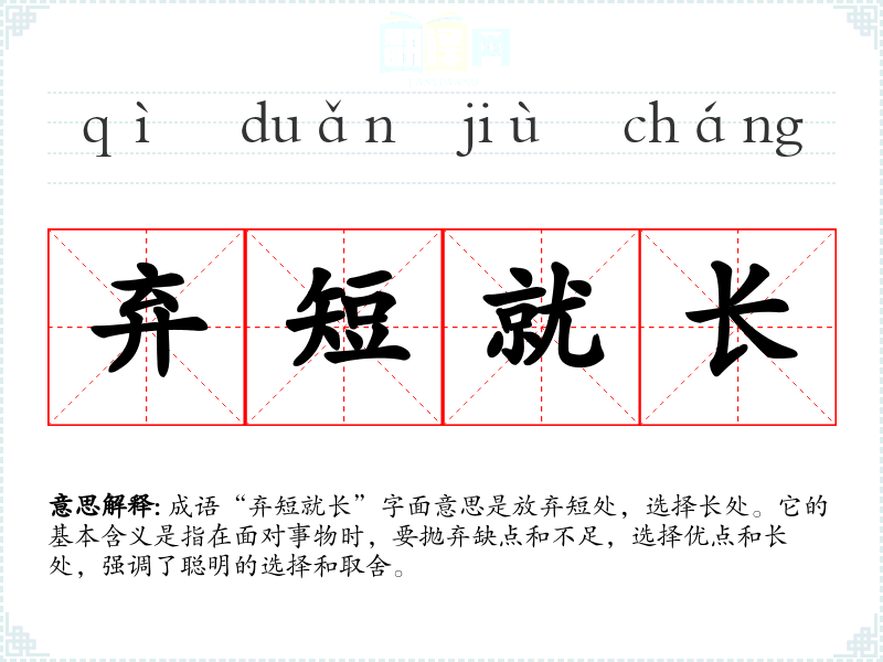 成语“弃短就长”字面意思是放弃短处,选择长处。它的基本含义是指在面对事物时,要抛弃缺点和不足,选择优点和长处,强调了聪明的选择和取舍。