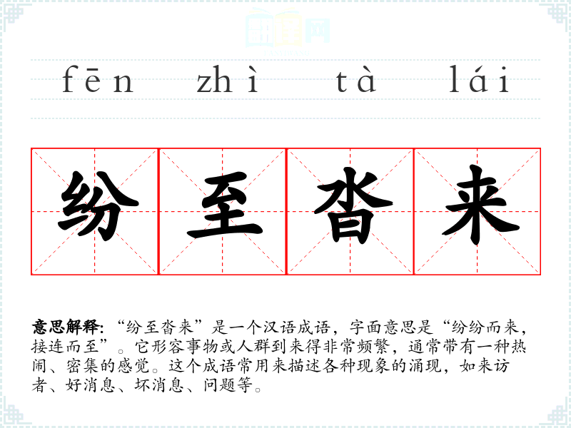 | 纷至沓来 | 纷:众多,杂乱;沓:多,重复。形容接连不断的到来。 |