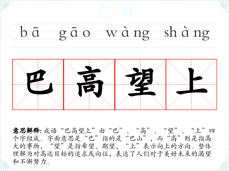 成语“巴高望上”由“巴”、“高”、“望”、“上”四个字组成。字面意思是“巴”指的是“巴山”,而“高”则是指高大的事物,“望”是指希望、期望,“上”表示向上的方向。整体理解为对高远目标的追求或向往,表达了人们对于美好未来的渴望和不懈努力。