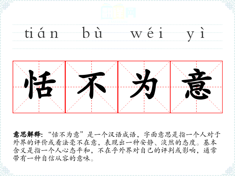 “恬不为意”是一个汉语成语,字面意思是指一个人对于外界的评价或看法毫不在意,表现出一种安静、淡然的态度。基本含义是指一个人心态平和,不在乎外界对自己的评判或影响,通常带有一种自信从容的意味。