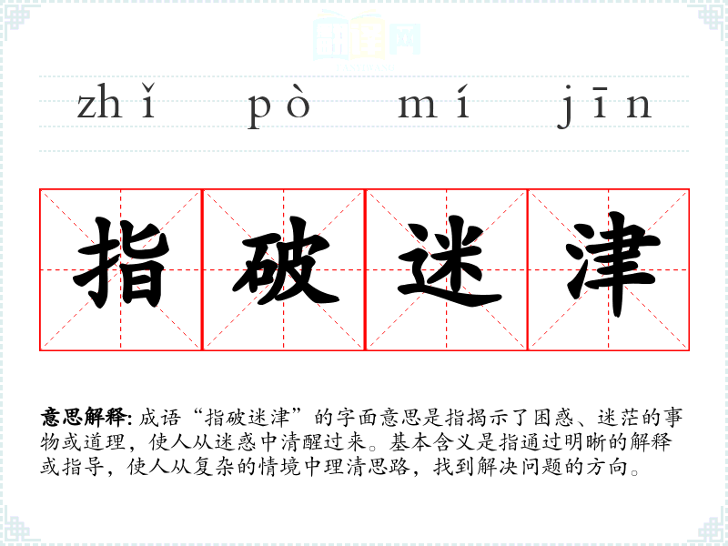 成语“指破迷津”的字面意思是指揭示了困惑、迷茫的事物或道理,使人从迷惑中清醒过来。基本含义是指通过明晰的解释或指导,使人从复杂的情境中理清思路,找到解决问题的方向。