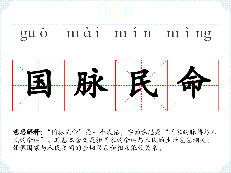 “国脉民命”是一个成语,字面意思是“国家的脉搏与人民的命运”。其基本含义是指国家的命运与人民的生活息息相关,强调国家与人民之间的密切联系和相互依赖关系。