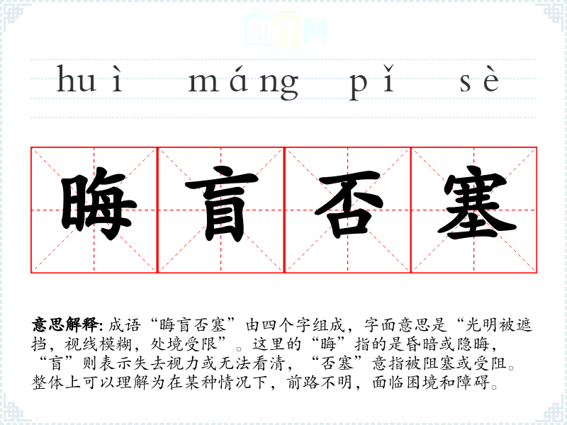 成语“晦盲否塞”由四个字组成,字面意思是“光明被遮挡,视线模糊,处境受限”。这里的“晦”指的是昏暗或隐晦,“盲”则表示失去视力或无法看清,“否塞”意指被阻塞或受阻。整体上可以理解为在某种情况下,前路不明,面临困境和障碍。