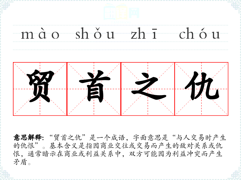 “贸首之仇”是一个成语,字面意思是“与人交易时产生的仇恨”。基本含义是指因商业交往或交易而产生的敌对关系或仇恨,通常暗示在商业或利益关系中,双方可能因为利益冲突而产生矛盾。