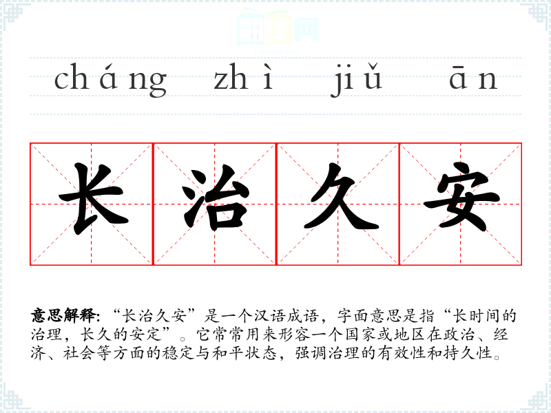 “长治久安”是一个汉语成语,字面意思是指“长时间的治理,长久的安定”。它常常用来形容一个国家或地区在政治、经济、社会等方面的稳定与和平状态,强调治理的有效性和持久性。