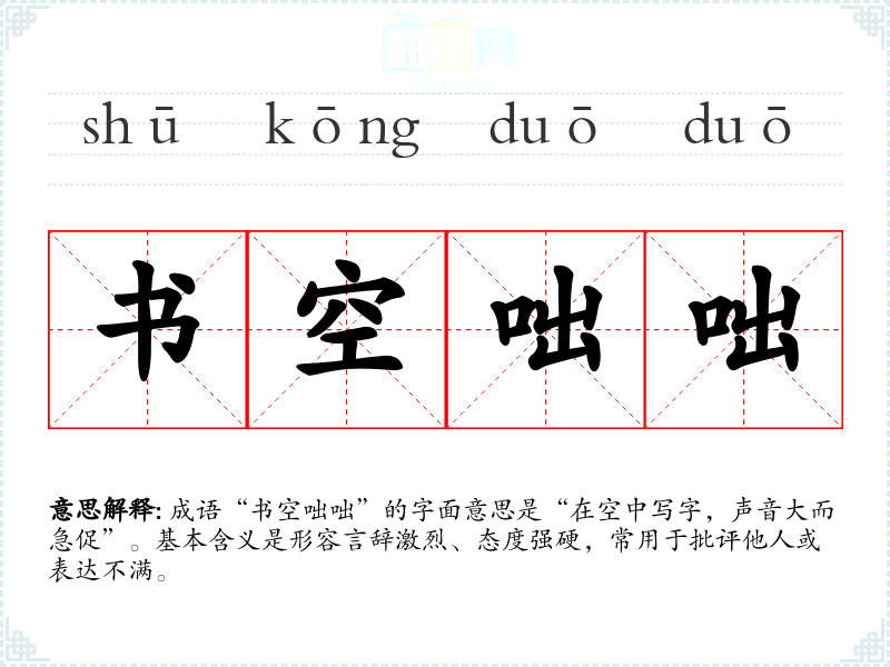 成语“书空咄咄”的字面意思是“在空中写字,声音大而急促”。基本含义是形容言辞激烈、态度强硬,常用于批评他人或表达不满。