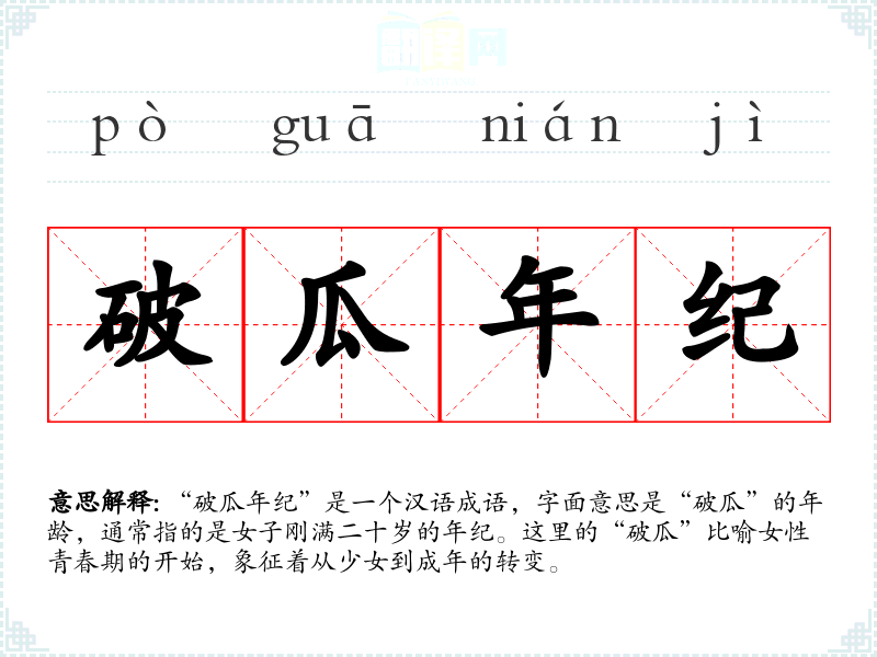 “破瓜年纪”是一个汉语成语,字面意思是“破瓜”的年龄,通常指的是女子刚满二十岁的年纪。这里的“破瓜”比喻女性青春期的开始,象征着从少女到成年的转变。