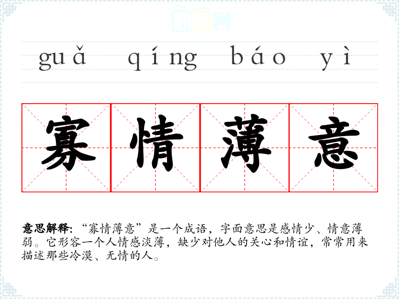 “寡情意”是一个成语,字面意思是感情少、情意弱。它形容一个人情感淡*,缺少对他人的关心和情谊,常常用来描述那些冷漠、无情的人。