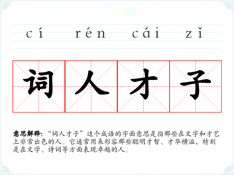 “词人才子”这个成语的字面意思是指那些在文字和才艺上非常出色的人。它通常用来形容那些聪明才智、才华横溢,特别是在文学、诗词等方面表现卓越的人。