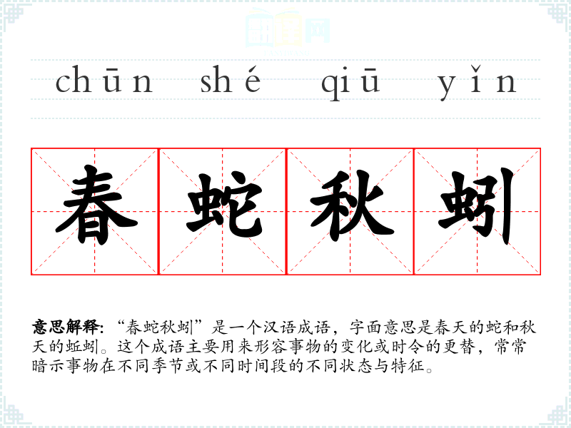 在英语中,可以用“Change is the only constant”来表达类似的意义,强调变化是生活中不可避免的部分。然而,中文的“春蛇秋蚓”更具季节感和自然意象,能够引发更深层次的文化联想。