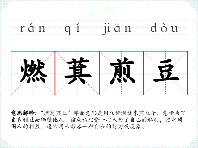 “燃萁煎豆”字面意思是用豆秆燃烧来煎豆子,意指为了自我利益而牺牲他人。该成语比喻一些人为了自己的私利,损害周围人的利益,通常用来形容一种自私的行为或现象。
