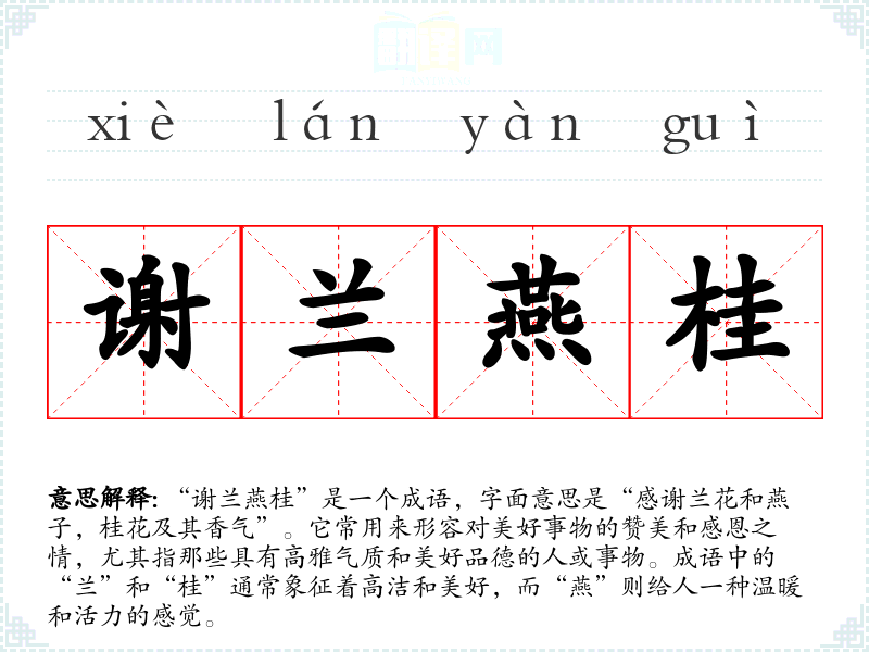 “谢兰燕桂”出自**古代文学,尤其是在诗词和散文中常常出现。虽然没有确切的历史典故,但它的构成元素在传统文化中频繁出现,兰花和桂花都是文人雅士所推崇的植物,象征着高尚的情操和品德。因此,成语的使用可以追溯到古代文人对自然的观察和对美好事物的礼赞。