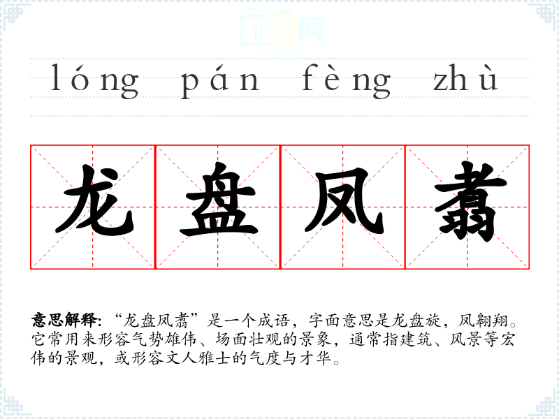 “龙盘凤翥”是一个成语,字面意思是龙盘旋,凤翱翔。它常用来形容气势雄伟、场面壮观的景象,通常指建筑、风景等宏伟的景观,或形容文人雅士的气度与才华。