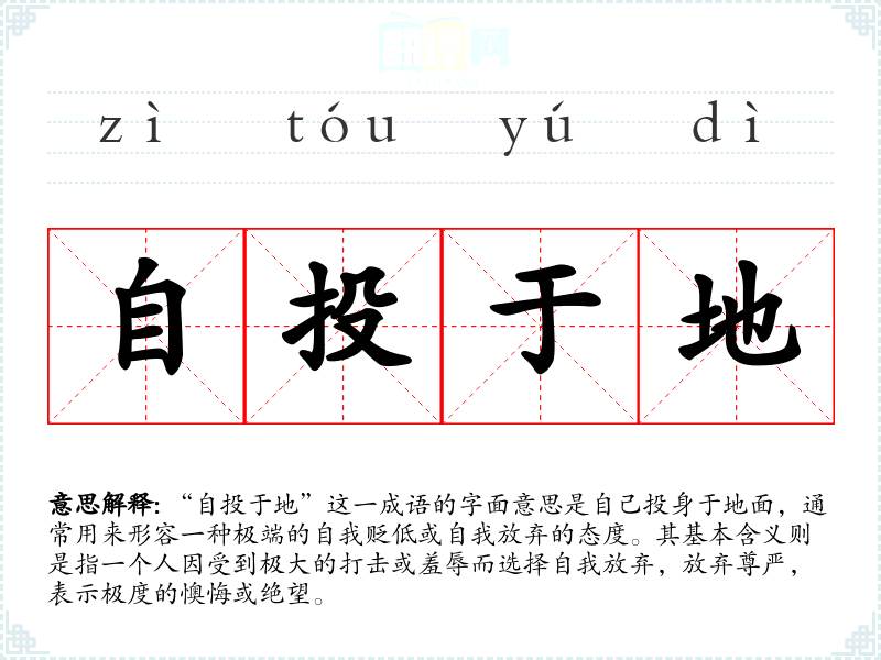 “自投于地”这一成语的字面意思是自己投身于地面,通常用来形容一种极端的自我贬低或自我放弃的态度。其基本含义则是指一个人因受到极大的打击或羞辱而选择自我放弃,放弃尊严,表示极度的懊悔或绝望。