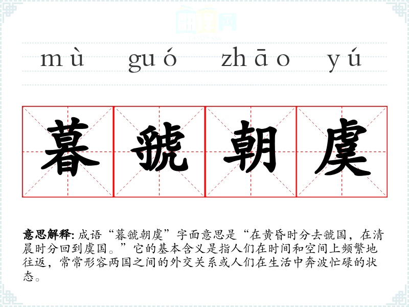 成语“暮虢朝虞”字面意思是“在黄昏时分去虢国,在清晨时分回到虞国。”它的基本含义是指人们在时间和空间上频繁地往返,常常形容两国之间的外交关系或人们在生活中奔波忙碌的状态。
