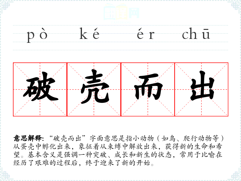“破壳而出”字面意思是指小动物(如鸟、爬行动物等)从蛋壳中孵化出来,象征着从束缚中解放出来,获得新的生命和希望。基本含义是强调一种突破、成长和新生的状态,常用于比喻在经历了艰难的过程后,终于迎来了新的开始。