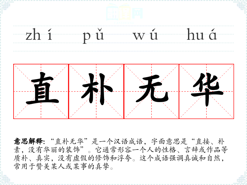 “直朴无华”是一个汉语成语,字面意思是“直接、朴素,没有华丽的装饰”。它通常形容一个人的性格、言辞或作品等质朴、真实,没有虚假的修饰和浮夸。这个成语强调真诚和自然,常用于赞美某人或某事的真挚。