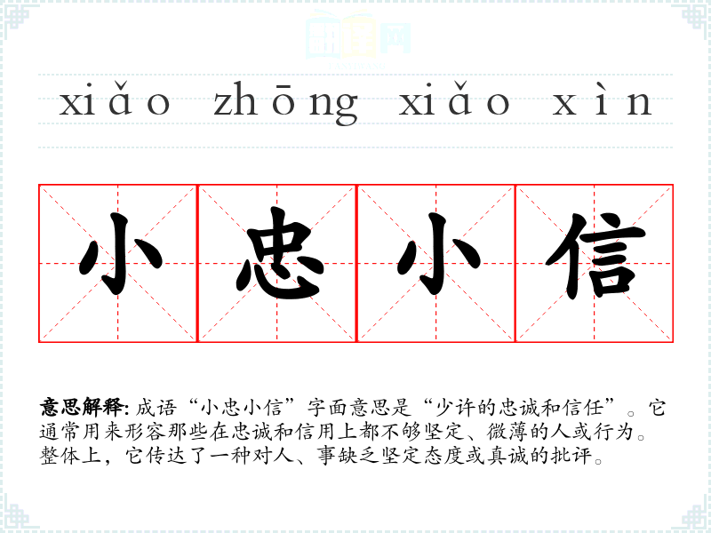 “小忠小信”并没有明显的历史典故或出处,更多是基于对“忠”和“信”的理解而形成的成语。忠诚和信用在**传统文化中被视为重要的品德,强调个体在道德和情感方面的责任。这个成语反映了对这些价值的轻视与否定。